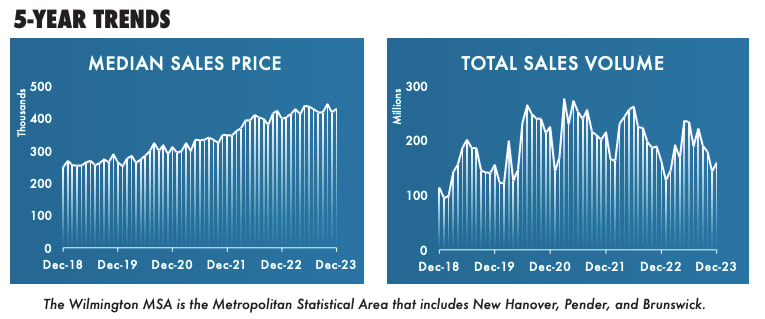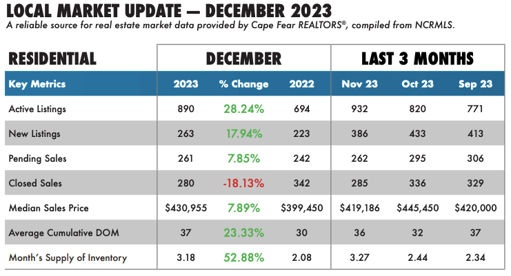 The December 2023 housing market in the Wilmington Metropolitan Statistical Area (MSA) follows similar trends to the previous year. As the year ends, the market typically cools down. December 2023 saw the highest number of active listings in the past year, totaling 2,723 listings. However, the median sales price for New Hanover, Pender, and Brunswick Counties decreased to $389,200, down 2.7 percent from November 2023 but up 2.42 percent from the previous year.