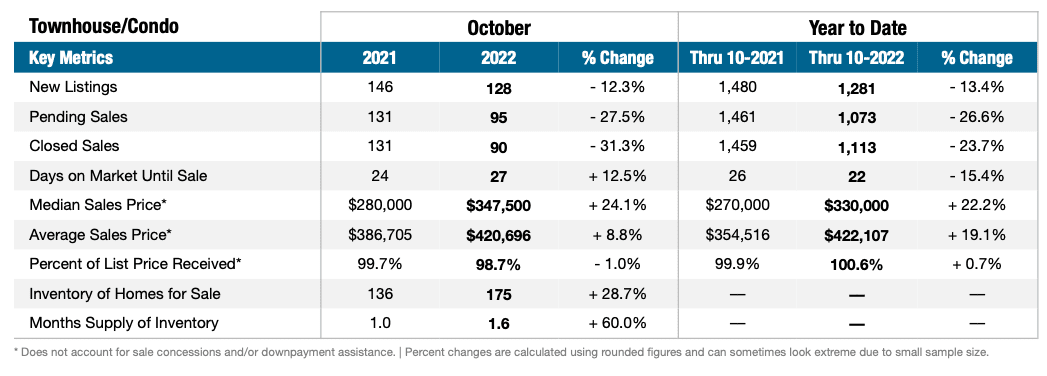 - Months Supply of Inventory in Single Family Homes and Townhouse/Condos have both increased. If looking for properties, you now have more inventory now compared to the past year to browse.