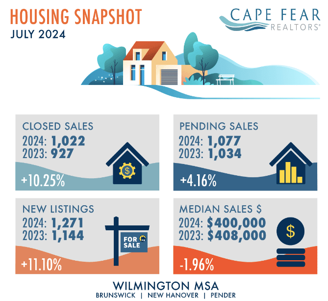 As July 2024 ends, the Wilmington Metropolitan Statistical Area (MSA) reaches a significant milestone with housing inventory peaking at 3,238 active listings—a 49.5% increase from July 2023. This marks the highest level of active listings since June 2020, driven primarily by Brunswick County, which accounted for 1,899 listings. New Hanover and Pender Counties followed with 1,026 and 313 listings, respectively.