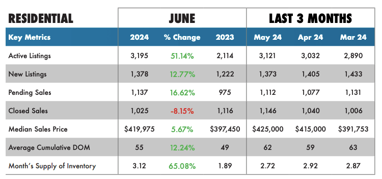 Over the past three months, the market has shown consistent activity. Active listings have steadily increased from 2,890 in March to 3,195 in June. New listings and pending sales have remained robust, with slight variations each month. However, the number of closed sales has fluctuated, peaking in April at 1,146 and decreasing to 1,025 in June.