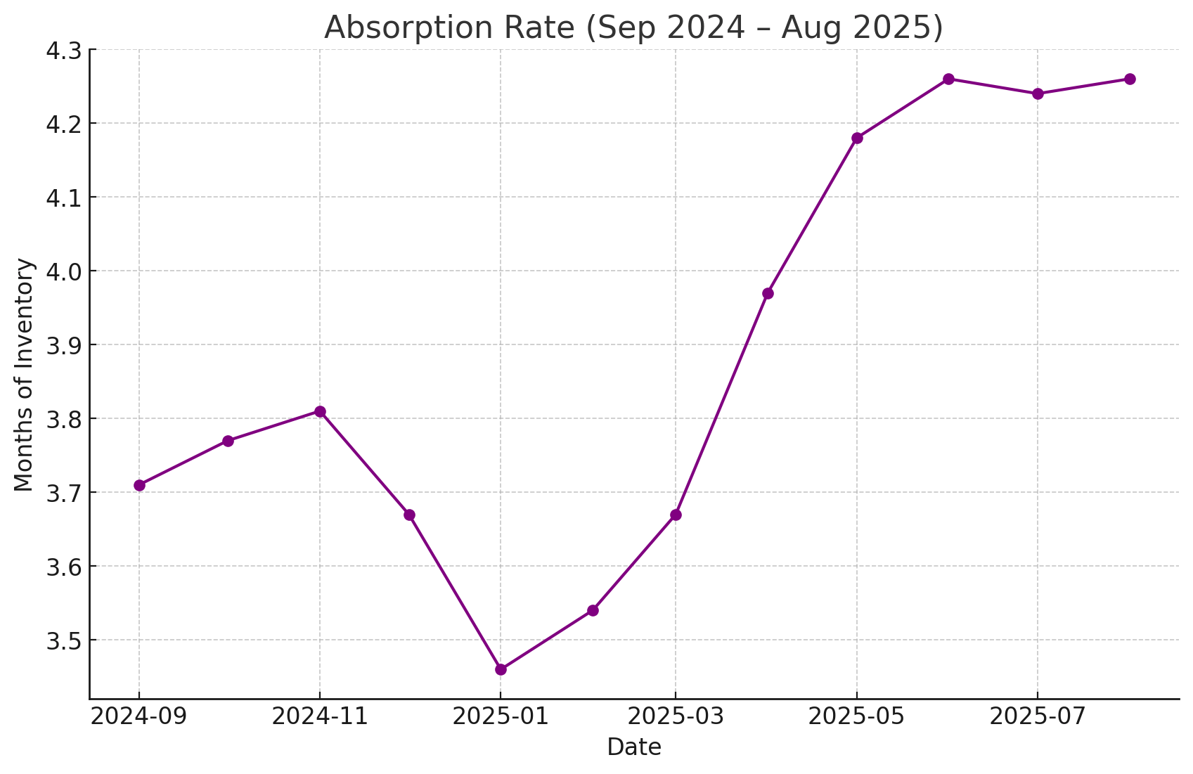Absorption rate, a key measure of market balance, ranged from a low of 3.46 months of inventory in January 2025 to a high of 4.26 in June 2025.