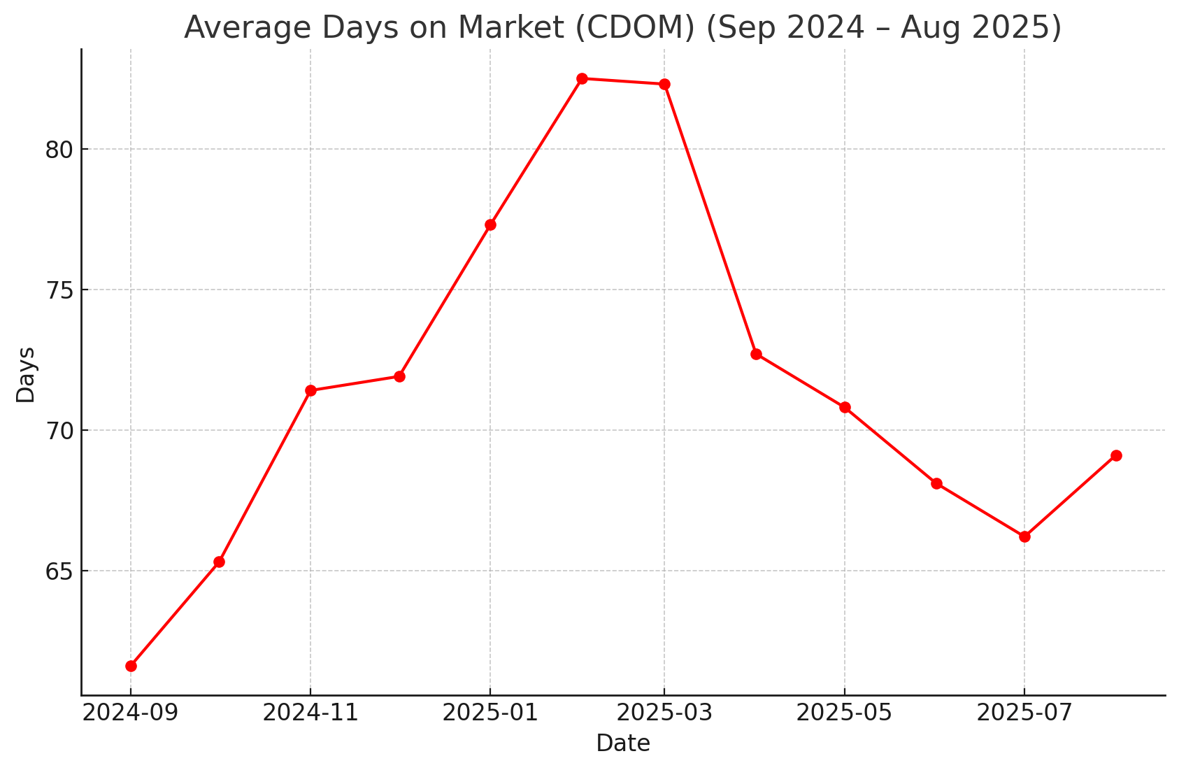 Figure 4. Average Days on Market (CDOM) (Sep 2024 – Aug 2025). Homes lingered in winter but sold more quickly in the fall.