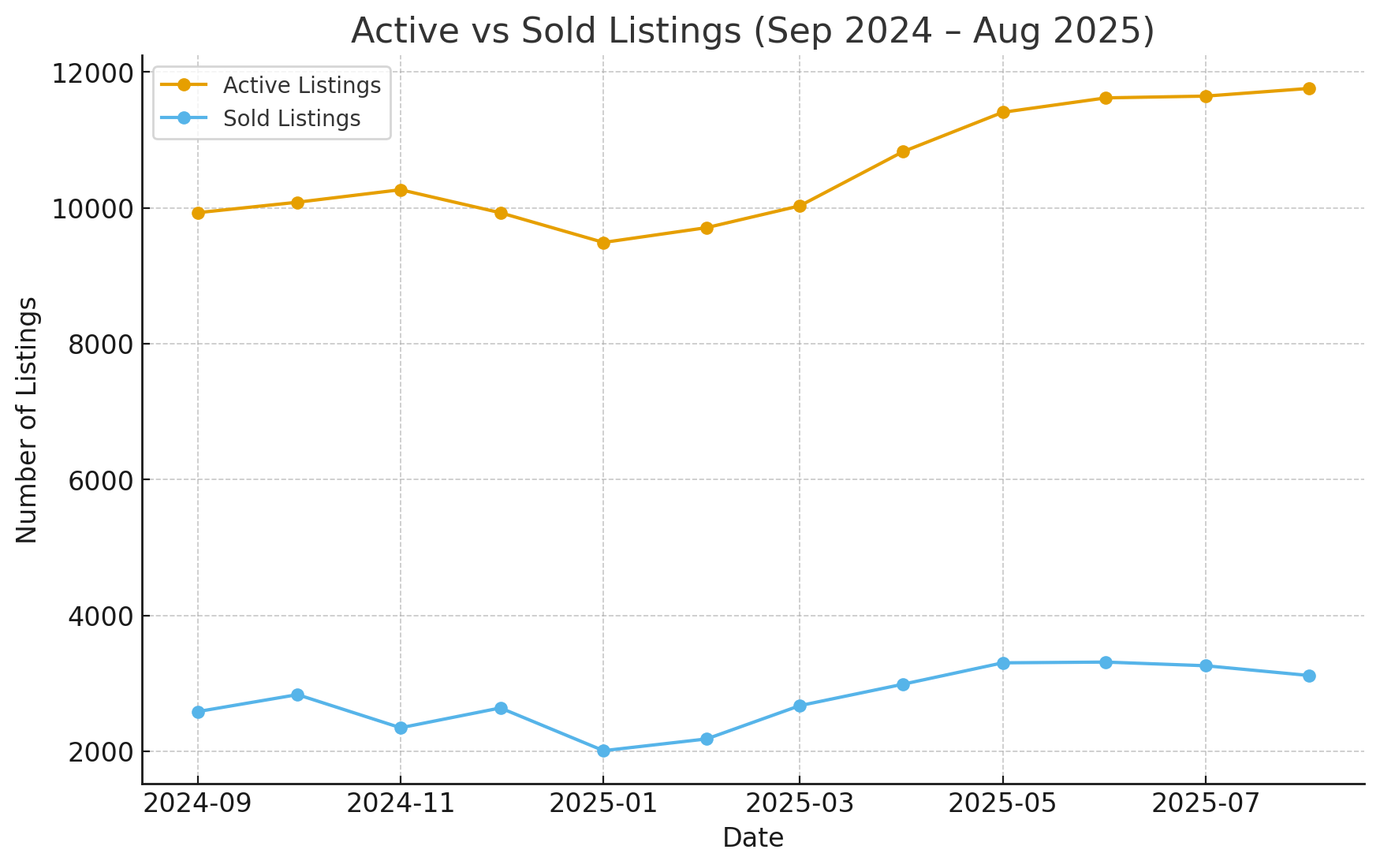 Figure 1. Active vs. Sold Listings (Sep 2024 – Aug 2025). Inventory built steadily through spring and peaked in August, while sales followed a summer high.
